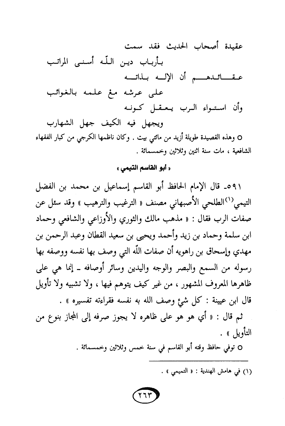 591 - قَالَ الإِمَام الْحَافِظ أَبُو الْقَاسِم إِسْمَاعِيل بن مُحَمَّد بن الْفضل التَّيْمِيّ الطلحي الْأَصْبَهَانِيّ مُصَنف التَّرْغِيب والترهيب وَقد سُئِلَ عَن صِفَات الرب فَقَالَ مَذْهَب مَالك وَالثَّوْري وَالْأَوْزَاعِيّ وَالشَّافِعِيّ وَحَمَّاد ابْن سَلمَة وَحَمَّاد بن زيد وَأحمد وَيحيى بن سعيد الْقطَّان وَعبد الرَّحْمَن بن مهْدي وَإِسْحَاق بن رَاهَوَيْه أَن صِفَات الله الَّتِي وصف بهَا نَفسه وَوَصفه بهَا رَسُوله من السّمع وَالْبَصَر وَالْوَجْه وَالْيَدَيْنِ وَسَائِر أَوْصَافه إِنَّمَا هِيَ على ظَاهرهَا الْمَعْرُوف الْمَشْهُور من غير كَيفَ يتَوَهَّم فِيهَا وَلَا تَشْبِيه وَلَا تَأْوِيل قَالَ ابْن عُيَيْنَة كل شَيْء وصف الله بِهِ نَفسه فقراءته تَفْسِيره