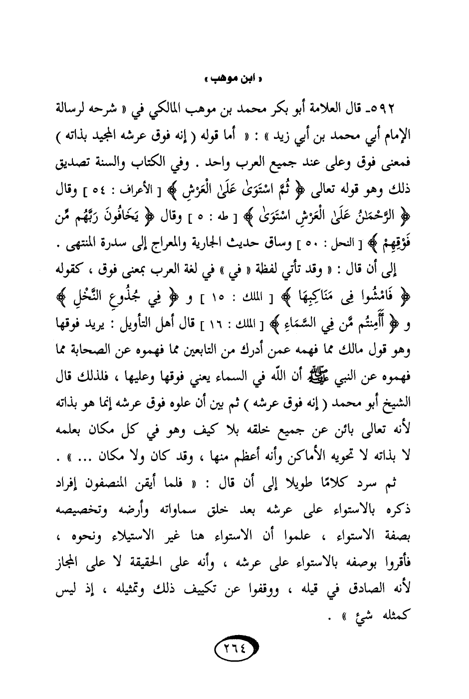 592 - قَالَ الْعَلامَة أَبُو بكر مُحَمَّد بن موهب الْمَالِكِي فِي شَرحه لرسالة الإِمَام أبي مُحَمَّد بن أبي زيد أما قَوْله إِنَّه فَوق عَرْشه الْمجِيد بِذَاتِهِ فَمَعْنَى فَوق وعَلى عِنْد جَمِيع الْعَرَب وَاحِد
