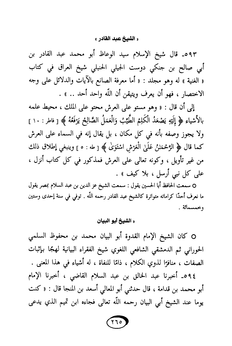 إِلَى أَن قَالَ وَهُوَ مستو على الْعَرْش محتو على الْملك مُحِيط علمه بالأشياء {إِلَيْهِ يَصْعَدُ الْكَلِمُ الطّيب وَالْعَمَل الصَّالح يرفعهُ} وَلَا يجوز وَصفه بِأَنَّهُ فِي كل مَكَان بل يُقَال إِنَّه فِي السَّمَاء على الْعَرْش كَمَا قَالَ {الرَّحْمَنُ على الْعَرْش اسْتَوَى} وَيَنْبَغِي إِطْلَاق ذَلِك من غير تَأْوِيل وَكَونه تَعَالَى على الْعَرْش فمذكور فِي كل كتاب أنزل على كل نَبِي أرسل بِلَا كَيفَ // سَمِعت الْحَافِظ أَبَا الْحُسَيْن يَقُول سَمِعت الشَّيْخ عز الدّين بن عبد السَّلَام بِمصْر يَقُول مَا نَعْرِف أحدا كراماته متواترة كالشيخ عبد الْقَادِر رَحمَه الله