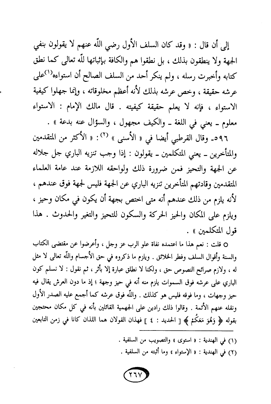 إِلَى أَن قَالَ وَقد كَانَ السّلف الأول رَضِي الله عَنْهُم لَا يَقُولُونَ بِنَفْي الْجِهَة وَلَا ينطقون بذلك بل نطقوا هم والكافة بإثباتها لله تَعَالَى كَمَا نطق كِتَابه وأخبرت رسله وَلم يُنكر أحد من السّلف الصَّالح أَن إستواءه على عَرْشه حَقِيقَة وَخص عَرْشه بذلك لِأَنَّهُ أعظم مخلوقاته وَإِنَّمَا جهلوا كَيْفيَّة الاسْتوَاء فَإِنَّهُ لَا يعلم حَقِيقَة كيفيته