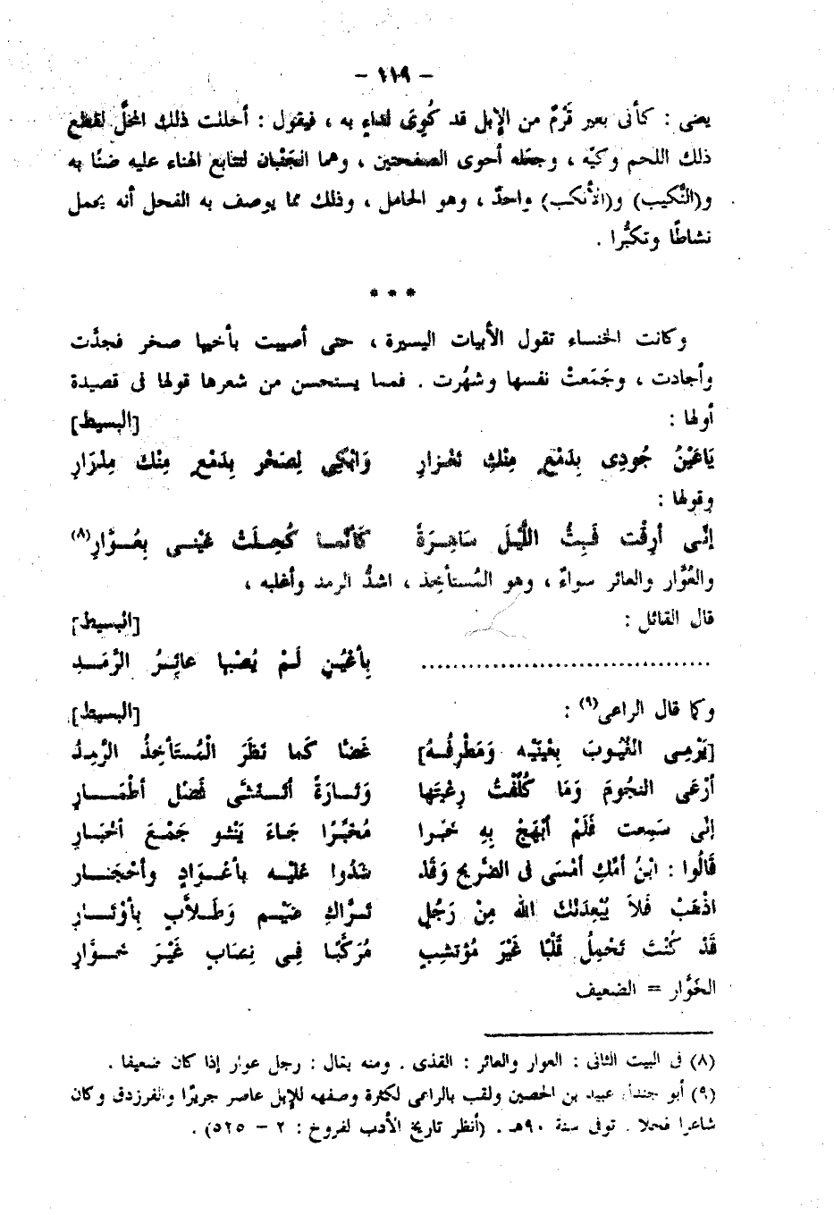 يعني: كأني بعير قرم من الإبل قد كوي لداء به، فيقول: أحللت ذاك المحل لقطع ذلك اللحم وكيه، وجعله أحوى الصفحتين، وهما الجنبان، لتتابع الهناء عليه ضناً به والنكيب والأنكب واحد، وهو الحامل، وذلك مما يوصف به الفحل أنه يحمل نشاطاً وتكبراً.