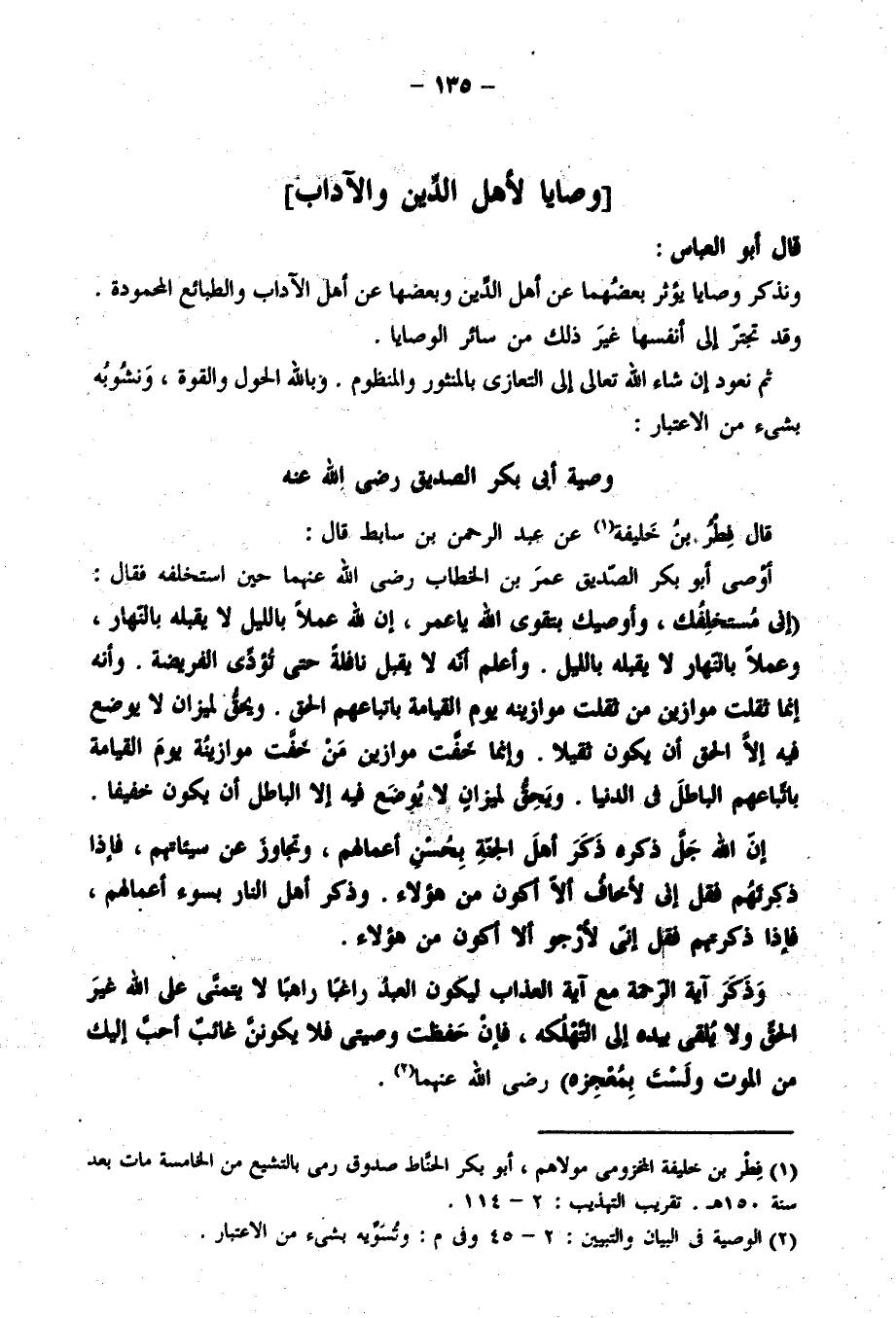 قال أبو العباس: ونذكر وصايا يؤثر بعضها عن أهل الدين وبعضها عن أهل الآداب والطبائع المحمودة. وقد تجتر إلى أنفسها غير ذلك من سائر الوصايا. ثم نعود إن شاء الله تعالى إلى التعازي بالمنثور والموصوف. وبالله الحول والقوة، ونشوبه بشيء من الاعتبار: