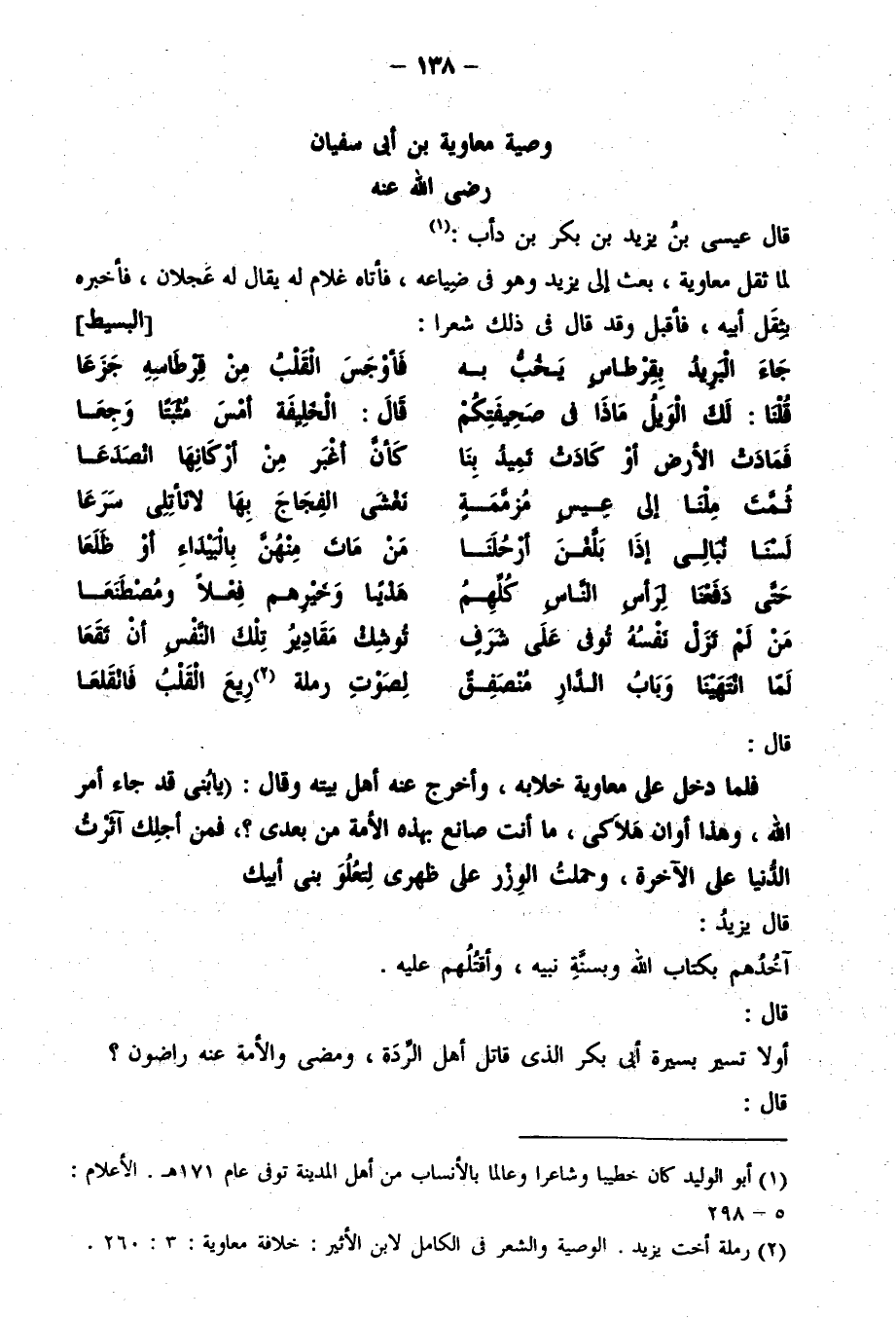 قال: فلما دخل على معاوية خلا به وأخرج عنه أهل بيته وقال: يا بني قد جاء أمر الله، وهذا أوان هلاكي، ما أنت صانع بهذه الأمة بعدي؟ فمن أجلك آثرت الدنيا على الآخرة، وحملت الوزر على ظهري لتعلو بني أبيك. قال يزيد: آخذهم بكتاب الله وسنة رسوله وأقتلهم عليه. قال: أولا تسير بسيرة أبي بكر الذي قاتل أهل الردة ومضى والأمة عنه راضون؟. قال: