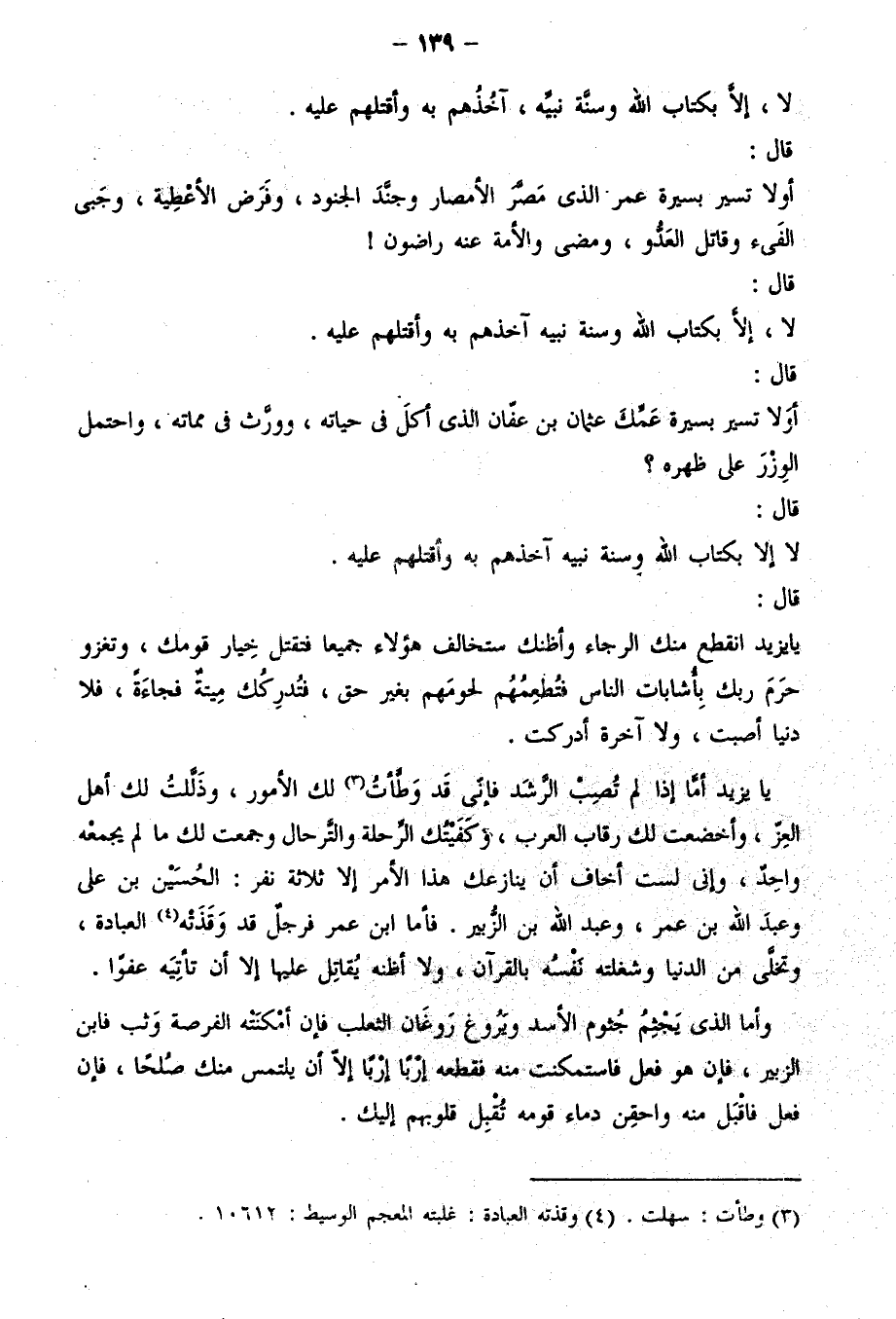 لا، إلا بكتاب الله وسنة نبيه، آخذهم به وأقتلهم عليه. قال: أولا تسير بسيرة عمر الذي مصر الأمصار وجند الأجناد، وفرض الأعطية، وجبى الفيء وقاتل العدو، ومضى والأمة عنه راضون؟. قال: لا، إلا بكتاب الله وسنة نبيه عليه السلام، آخذهم به وأقتلهم عليه. قال: أولا تسير بسيرة عمك عثمان بن عفان الذي أكل في حياته، وورث في مماته، واحتمل الوزر على ظهره؟. قال: لا، إلا بكتاب الله وسنة نبيه، آخذهم به واقتلهم عليه. قال: يا يزيد، انقطع منك الرجاء وأظنك ستخالف هؤلاء جميعاً فتقتل خيار قومك وتغزو حرم ربك بأشابات الناس فتطعمهم لحومهم بغير الحق فتدركك ميتة فجاءة، فلا دنيا أصبت، ولا آخرة أدركت. يا يزيد أما إذا لم تصب الرشد فإني قد وطأت لك الأمور، وذللت لك أهل العز، وأخضعت لك رقاب العرب، وكفيتك الرحلة والترحال، وجمعت لك ما لم يجمعه واحد، وإني لست أخاف أن ينازعك في هذا الأمر إلا ثلاثة نفر: الحسين ابن علي، وعبد الله بن عمر، وعبد الله بن الزبير. فأما عبد الله بن عمر فرجل قد وقذته العبادة وتخلى من الدنيا وشغل نفسه بالقرآن. وما أظنه يقاتل عليها إلا أن تأتيه عفواً. وأما الذي يجثم جثوم الأسد ويروغ روغان الثعلب، فإن أمكنته الفرصة وثب فابن الزبير، فإن هو فعل فاستمكنت منه فقطعه إرباً إرباً إلا أن يلتمس منك صلحاً، فإن فعل فاقبل منه واحقن دماء قومه تقبل قلوبهم إليك.