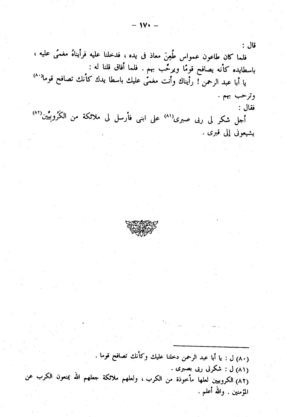 أستعيذ بالله السميع العليم من الشيطان الرجيم، أي بنية، إنه ليس أحد إلا وله من الشيطان لمة. فرثته عاتكة امرأته، وهي ابنة زيد بن عمرو بن نفيل فقالت: الطويل
