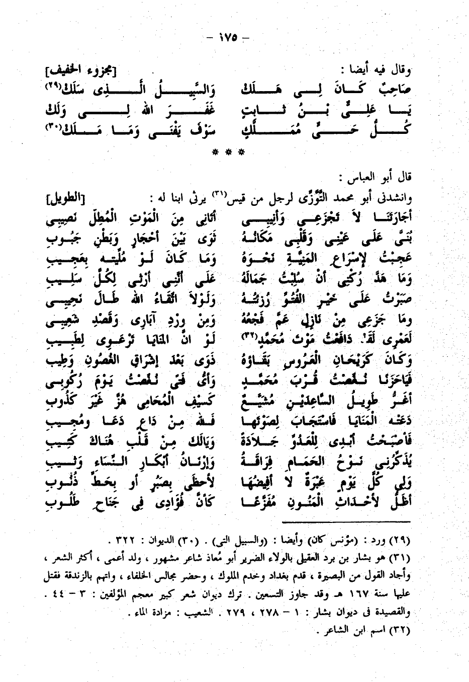 قال أبو العباس: وقصدنا في وقتنا هذا لذكر مراث من أشعار المحدثين لننزل بها من خشونة أشعار القدماء إلى لطف المولدين لمشاكلة الدهر وملاحة القول لنمضي من ذلك شيئاً ثم نعود إلى أمرنا الأول إن شاء الله تعالى من أشعار قديمة ومواعظ حكيمة. وبالله الحول والقوة.
