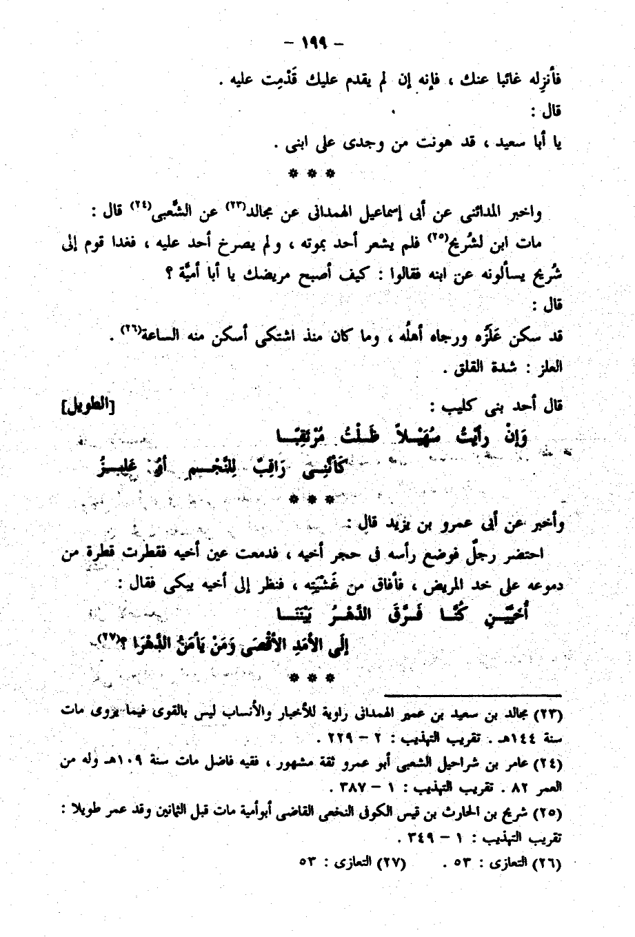 قال أبو العباس قد أملينا من أشعار المحدثين جملةً يخاف على مثلها الملل. وإنما كتابنا هذا وإن كان يقصد به معنى واحد فإنما يخرجه شيء من ذلك المعنى إلى آخر منه. فكأنه باب يخالف باباً. وهذا باب مواعظ وتعاز وأشعار داخلة في ذلك، موصولة به.