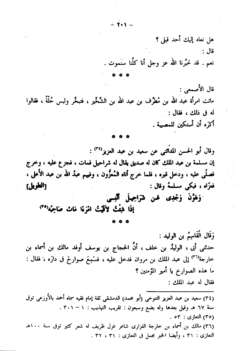 وأخبرنا عن مخلد بن حمزة عن عبد الملك بن عمير قال: دخل عبد الله ابن الزبير على أمه، أسماء ابنة أبي بكر الصديق رضي الله عنهما فقال: يا أمه، قد خذلني الناس، فلم يبق معي إلا من ليس عنده من المنع أكثر من صبر ساعة، والقوم يعطونني ما أردت. فما رأيك؟ قالت: يا بني، أنت أعلم بنفسك، إن كنت تعلم أنك على حق، وإليه تدعو، فامض على حقك، ولا تمكن غلمان بني أمية من نفسك. فقال: وفقك الله، هذا رأيي، وإني لحسن الظن بربي، فإن هلكت فلا يشتد جزعك علي، فإن ابنك لم يتعمد إتيان دنية، ولا عملاً بفاحشة، ولم يسع بغدر، ولم يجر في حكم، ولم يكن شيء آثر عنده من رضى ربه. اللهم إني لا أقول هذا تزكيةً لنفسي. أنت أعلم بي. ولكن أقوله لتسلو عني.