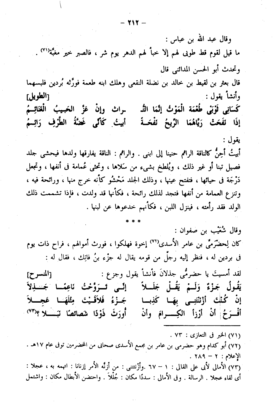 وكان علي بن أبي طالب، كرم الله وجهه يقول إذا عزى: إن تجزعوا فالرحم أهل ذلك منكم، وإن تصبروا ففي ثواب الله خلف من المصيبة. عظم الله أجركم.