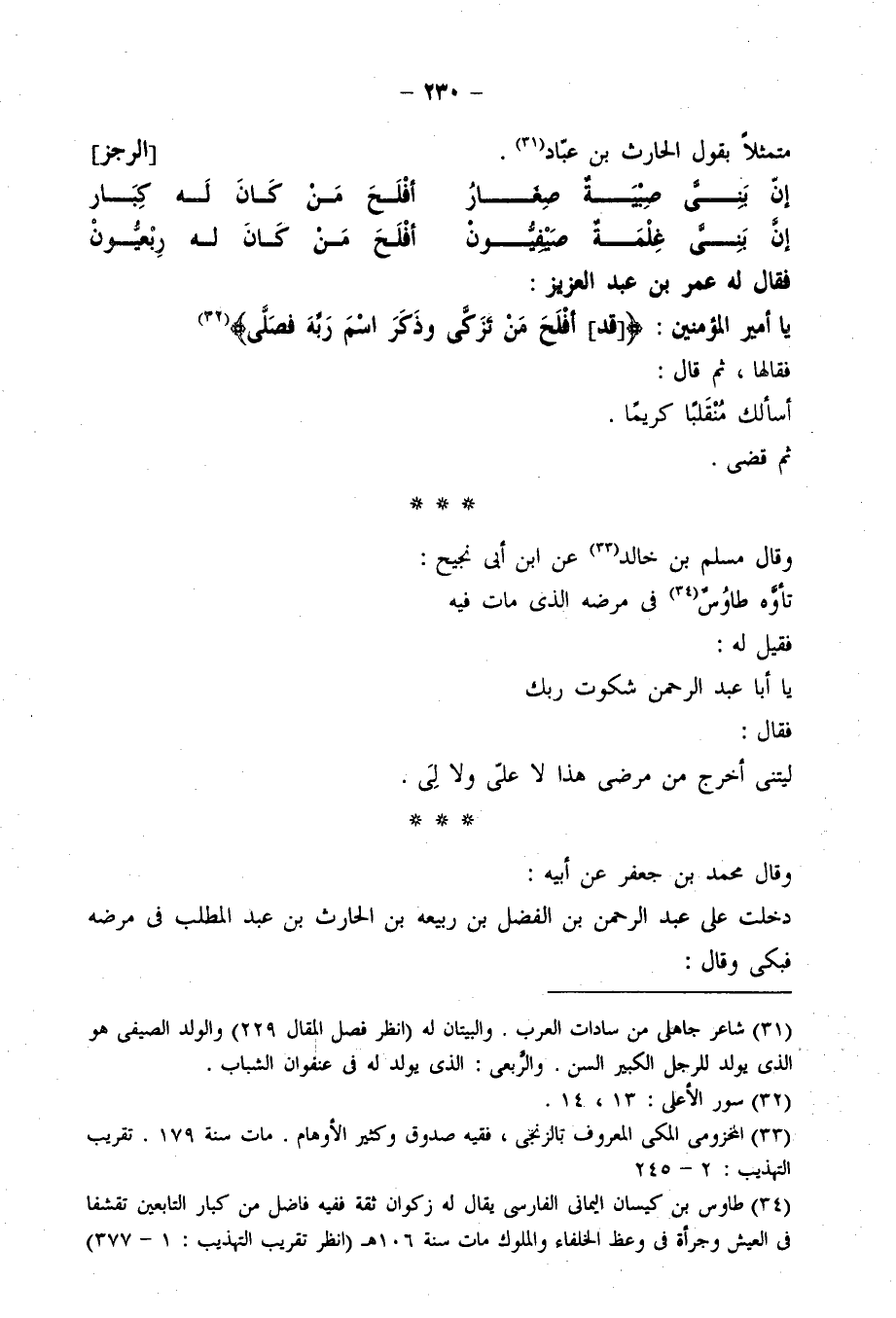 وقال هشام بن عاصم عن الشعبي أن عمر بن الخطاب رحمة الله عليه قال عند موته: ليتني أنجو من هذا الأمر كفافاً لا لي ولا علي. يا عبد الله، ضع خدي على الأرض، ويل لعمر ولأم عمر إن لم ينجه الله.
