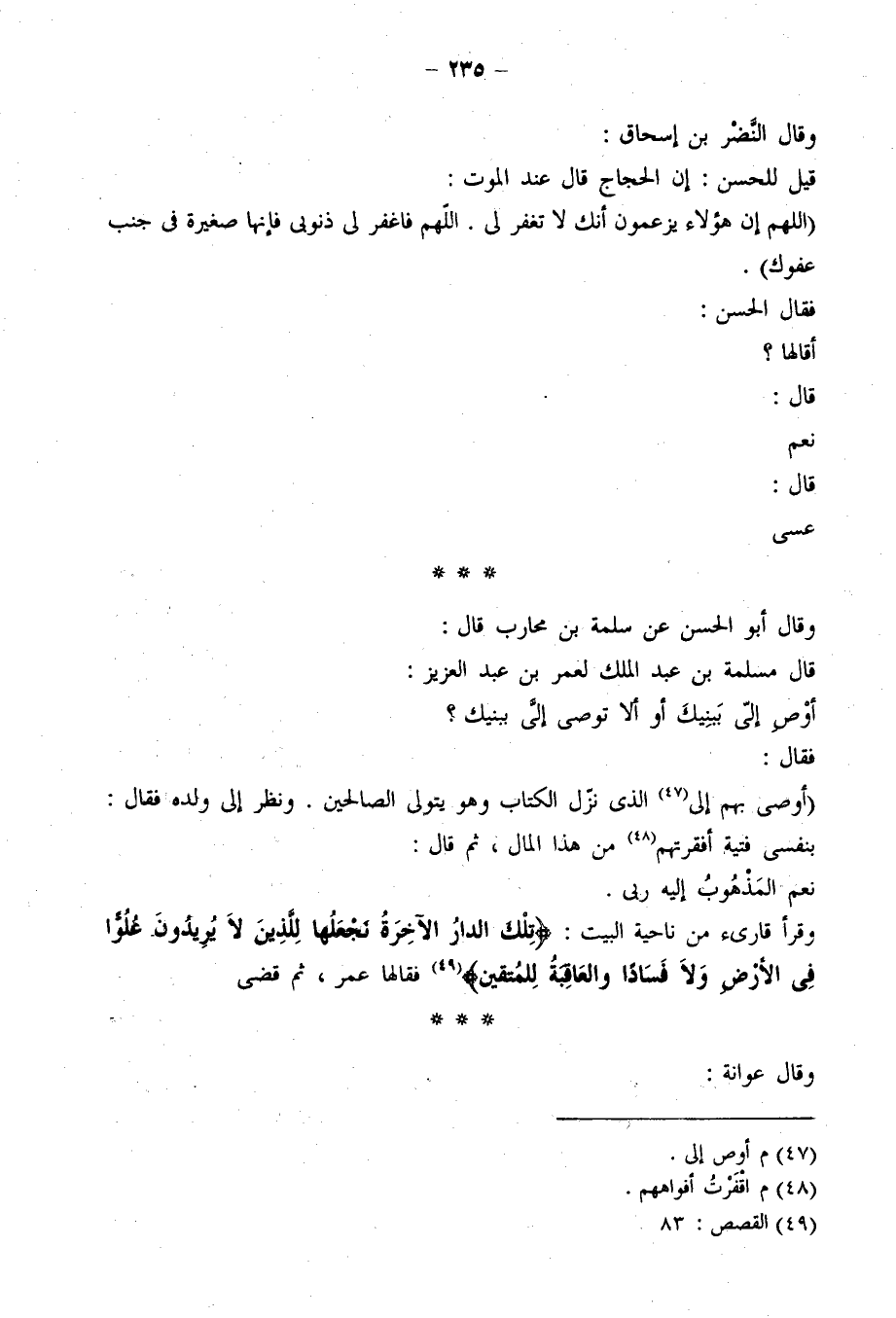 وقال أبو الحسن عن معاوية بن محمد عن عبد الله بن بجير قال: قال عبد الله بن عمرو بن العاصي لأبيه: يا أبه، كنت تقول: ليتني ألقى رجلاً عاقلاً عند نزول الموت به يحدثني ما يجد. وقد نزل بك وأنت ذلك الرجل فصف لي الذي تجد. قال: يا بني لكأن جنبي في تخت ولكأني أتنفس من سم إبرة، ولكأن غصن شوك يجر به من قدمي إلى هامتي. ثم قال متمثلاً قول أمية بن أبي الصلت: الخفيف