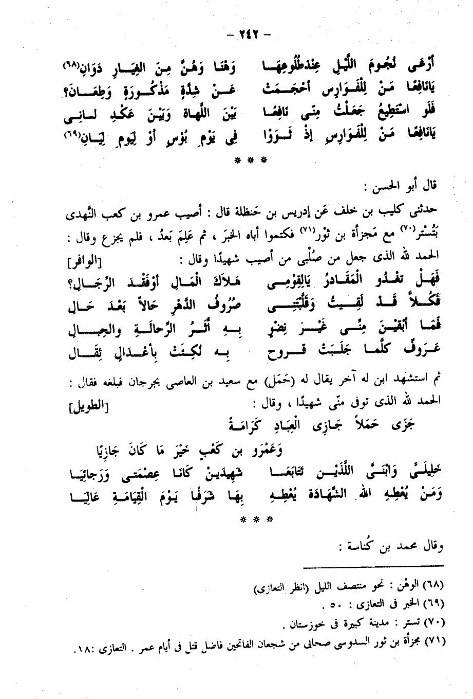 وقال أبو الحسن: أخبرني بعضهم قال: أتيت امرأةً أعزيها عن ابنها. قال فجعلت تثني عليه فقالت: كان، والله، ماله لغير بطنه، وأمره لغير عرسه، وكان: الطويل