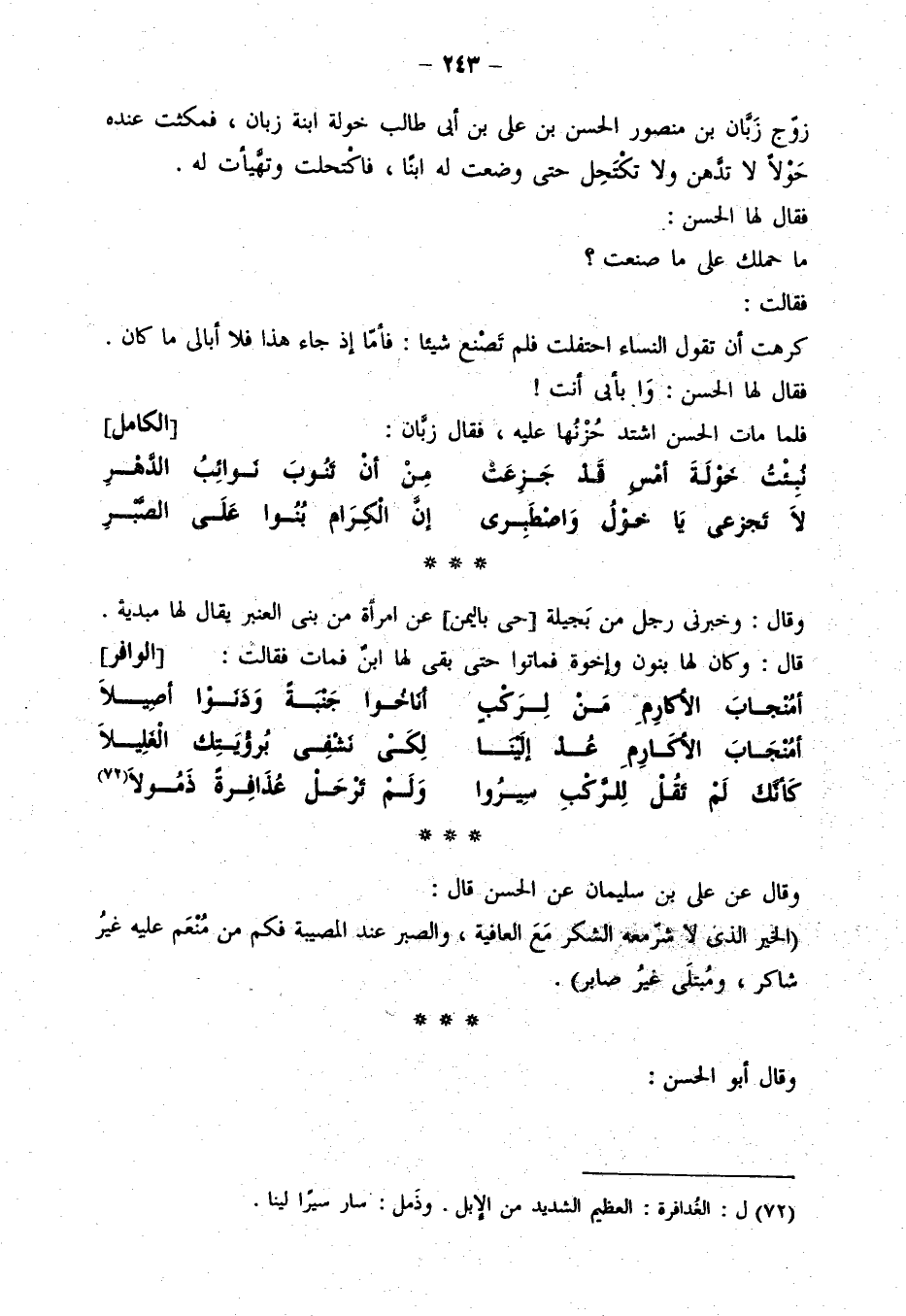 وقال: دخل درواش بن حبيب العجلي على جعفر بن سليمان يعزيه بأخيه محمد بن سليمان، فلما نظر إليه جعفر قال: إن كان عند أحد فرج فعند درواش. فسلم ثم قال: أيها الأمير، التمس ثواب الله بحسن العزاء، والشكر لأمر الله، واذكر مصيبتك في نفسك تنسك فقد غيرك واذكر قول النبي صلى الله عليه وسلم: من أصابته مصيبة فليذكر مصيبته بي فإنها من أعظم المصائب. واذكر قول الله عز وجل لنبيه صلى الله عليه وسلم: إنك ميت وإنهم ميتون، وقوله تعالى وما جعلنا لبشر من قبلك الخلد. وخذ بقول عبد الله بن أراكة في أخيه عمرو: الطويل