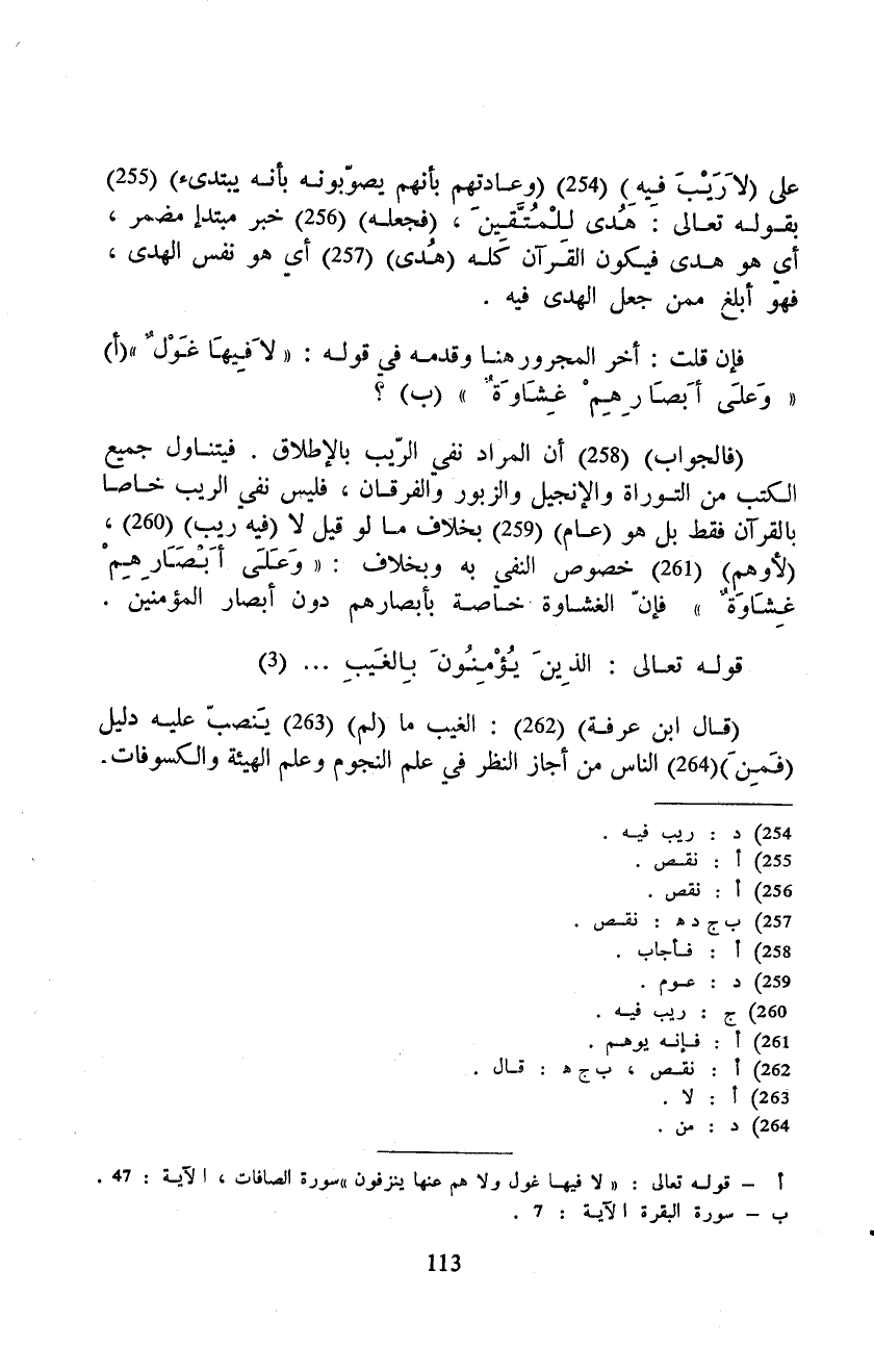 فإن قلت: أخر المجرور هنا وقدمه في قوله: {لاَ فِيهَا غَوْلٌ} {وعلى أَبْصَارِهِمْ غِشَاوَةٌ} (فالجواب) أن المراد نفي الرّيب بالإطلاق. فيتناول جميع الكتب من التوراة والإنجيل والزبور والفرقان، فليس نفي الريب خاصا بالقرآن فقط بل هو (عام) بخلاف ما لو قيل لا (فيه ريب) ، (لأوهم) خصوص النفي به وبخلاف: {وعلى أَبْصَارِهِمْ غِشَاوَةٌ} فإنّ الغشاوة خاصة بأبصارهم دون أبصار المؤمنين.