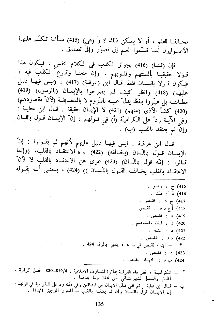 قال ابن عرفة: ليس فيها دليل عليهم لأنهم لم يقولوا: إنّ الإيمان قول باللّسان (يخالفه) ((الاعتقاد بالقلب، (وإنما قالوا: إنّه قول باللّسان) عري عن الاعتقاد بالقلب لا لأنّ الاعتقاد بالقلب يخالفه القول باللّسان)) ، بمعنى أنه يقوله