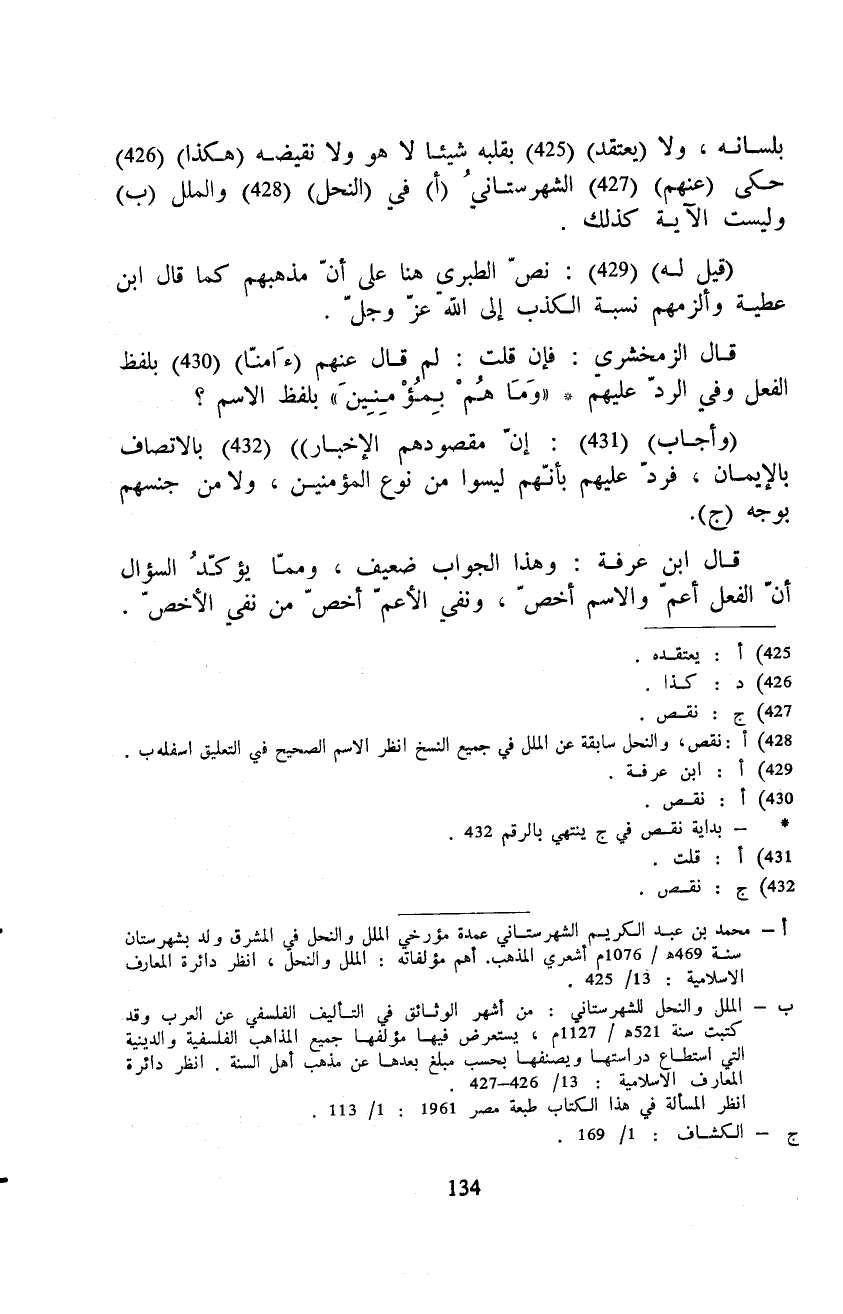 بلسانه، ولا (يعتقد) بقلبه شيئا لا هو ولا نقيضه (هكذا) حكى (عنهم) الشهرستاني في (النحل) والملل وليست الآية كذلك.