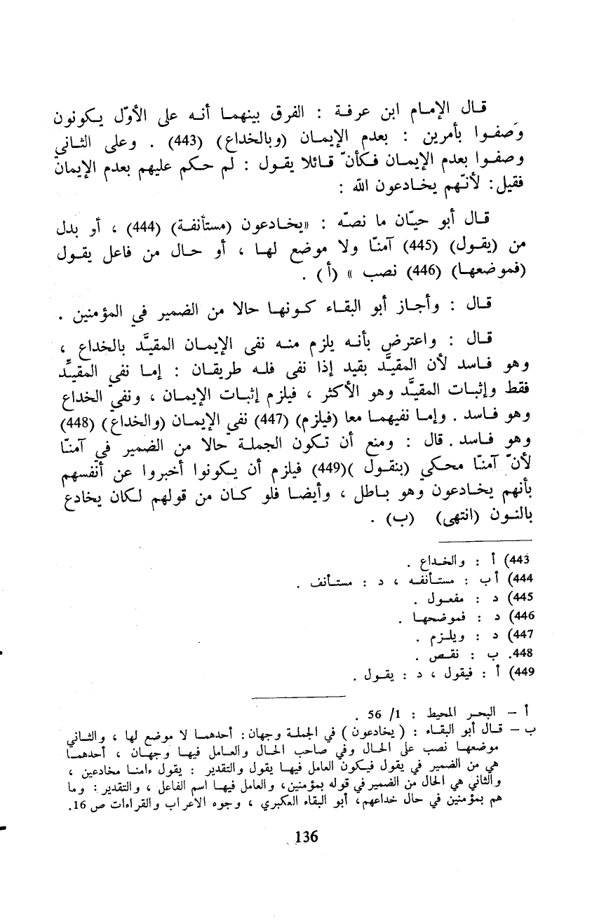 قال: واعترض بأنه يلزم منه نفى الإيمان المقيَّد بالخداع، وهو فاسد لأن المقيَّد بقيد إذا نفى فله طريقان: إما نفي المقيِّد فقط وإثبات المقيَّد وهو الأكثر، فيلزم إثبات الإيمان، ونفي الخداع وهو فاسد. وإما نفيهما معا (فيلزم) نفي الإيمان (والخداع) وهو فاسد. قال: ومنع أن تكون الجملة حالا من الضمير في آمنّا لأن آمنّا محكي (بنقول) فيلزم أن يكونوا أخبروا عن أنفسهم بأنهم يخادعون وهو باطل، وأيضا فلو كان من قولهم لكان يخادع بالنون (انتهى) .