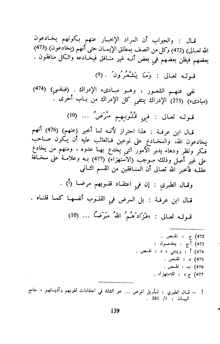 قال: (والجواب أن المراد الإخبار عنهم بكونهم يخادعون الله تعالى) وكل من اتصف بمطلق الإيمان حتى أنهم (يخادعون) بعضهم فيظن بعضهم في بعض أنه غير منافق فيخادعه والكل منافقون.