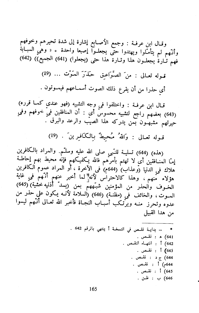 وقال ابن عرفة: وجمع الأصابع إشارة إلى شدة تحيرهم وخوفهم وأنّهم لم يتأمّلوا ويهتدوا حتى يجعلوا إصبعا واحدة ((وهي السبابة فهم تارة يجعلون هذا وتارة هذا حتى (يجعلوا) الجميع)) .