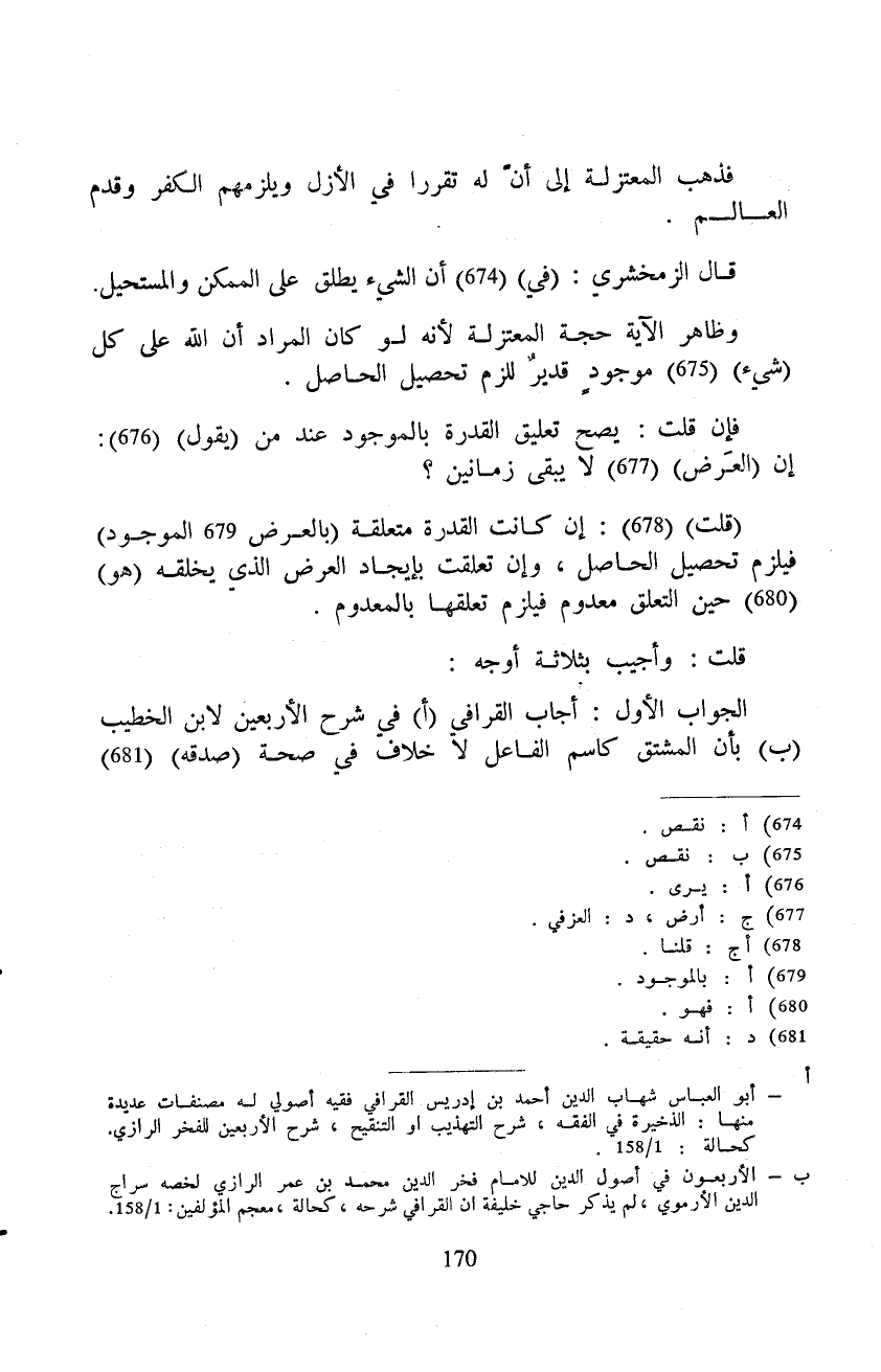(قلت) : إن كانت القدرة متعلقة (بالعرض الموجود) فيلزم تحصيل الحاصل، وإن تعلقت بإيجاد العرض الذي يخلقه (هو) حين التعلق معدوم فيلزم تعلقها بالمعدوم.