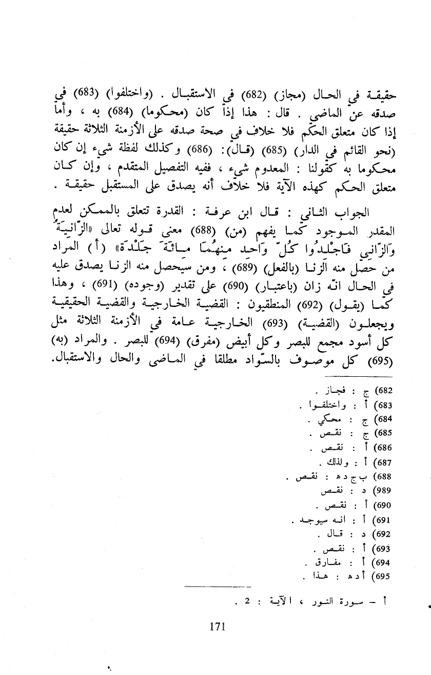 الجواب الثاني: قال ابن عرفة: القدرة تتعلق بالممكن لعدم المقدر الموجود كما يفهم (من) معنى قوله تعالى {الزانية والزاني فاجلدوا كُلَّ وَاحِدٍ مِّنْهُمَا مِاْئَةَ جَلْدَةٍ} المراد من حصل منه الزنا (بالفعل) ، ومن سيحصل منه الزنا يصدق عليه في الحال أنّه زان (باعتبار) على تقدير (وجوده) ، وهذا كما (يقول) المنطقيون: القضية الخارجية والقضية الحقيقية ويجعلون (القضية) الخارجية عامة في الأزمنة الثلاثة مثل كل أسود مجمع للبصر وكل أبيض (مفرق) للبصر. والمراد (به) كل موصوف بالسّواد مطلقا في الماضي والحال والاستقبال.