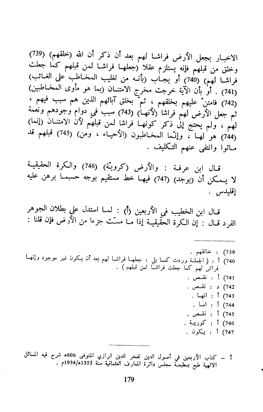 قال ابن عرفة: والأرض (كرويّة) والكرة الحقيقية لا يمكن أن (يوجد) فيها خط مستقيم بوجه حسبما برهن عليه إقليدس.
