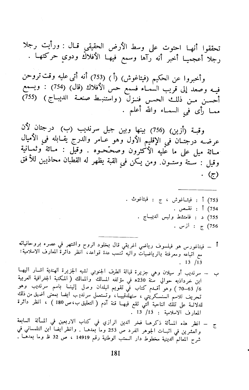 تحققوا أنها احتوت على وسط الأرض الحقيقي قال: ورأيت رجلا رجلا أعجميا أخبر أنه رآها وسمع فيها الأفلاك ودوي حركتها.
