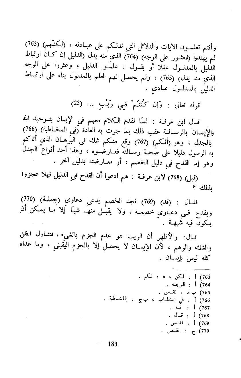 قال ابن عرفة: لمّا تقدم الكلام معهم في الإيمان بتوحيد الله والإيمان بالرسالة عقب ذلك بما جرت به العادة (في المخاطبة) بالجدل، وهو (أنكم) وقع منكم شك في البرهان الذي أتاكم به الرسول دليلا على صحة رسالته فعارضوه، وهذا أحد أنواع الجدل وهو إما القدح في دليل الخصم، أو معارضته بدليل آخر.