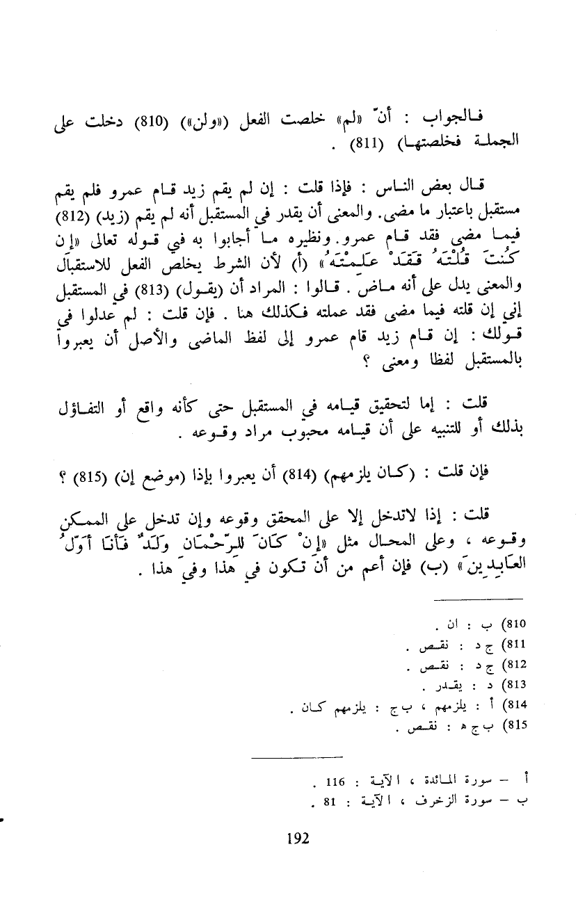 قال بعض الناس: فإذا قلت: إن لم يقم زيد قام عمرو فلم يقم مستقبل باعتبار ما مضى. والمعنى أن يقدر في المستقبل أنه لم يقم (زيد) فيما مضى فقد قام عمرو. ونظيره ما أجابوا به في قوله تعالى {إِن كُنتُ قُلْتُهُ فَقَدْ عَلِمْتَهُ} لأن الشرط يخلص الفعل للاستقبال والمعنى يدل على أنه ماض.