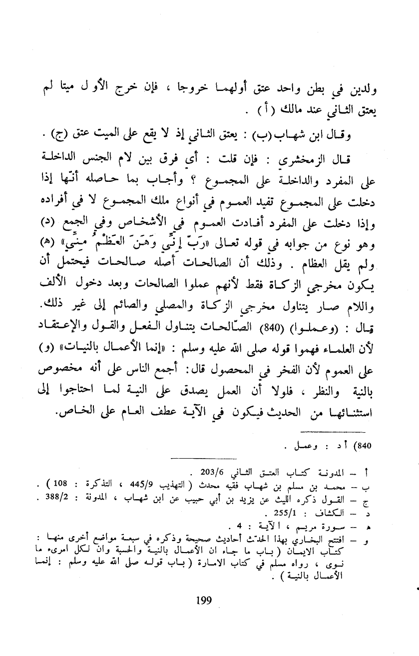 قال الزمخشري: فإن قلت: أي فرق بين لام الجنس الداخلة على المفرد والداخلة على المجموع؟ وأجاب بما حاصله أنّها إذا دخلت على المجموع تفيد العموم في أنواع ملك المجموع لا في أفراده وإذا دخلت على المفرد أفادت العموم في الأشخاص وفي الجمع وهو نوع من جوابه في قوله تعالى {رَبِّ إِنَّي وَهَنَ العظم مِنِّي} ولم يقل العظام. وذلك أن الصالحات أصله صالحات فيحتمل أن يكون مخرجي الزكاة فقط لأنهم عملوا الصالحات وبعد دخول الألف واللام صار يتناول مخرجي الزكاة والمصلي والصائم إلى غير ذلك. قال: (وعملوا) الصّالحات يتناول الفعل والقول والإعتقاد لأن العلماء فهموا قوله صَلَّى اللَّهُ عَلَيْهِ وَسَلَّم َ: «إنما الأعمال بالنيات» على العموم لأن الفخر في المحصول قال: أجمع الناس على أنه مخصوص بالنية والنظر، فلولا أن العمل يصدق على النية لما احتاجوا إلى استثنائها من الحديث فيكون في الآية عطف العام على الخاص.