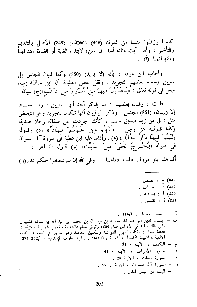 وأجاب ابن عرفة: بأنه (لا يريد) وأنها لبيان الجنس بل للتبيين وسماه بعضهم التجريد. ونقل بعض الطلبة أن ابن مالك جعل في قوله تعالى: {يُحَلَّوْنَ فِيهَا مِنْ أَسَاوِرَ مِن ذَهَبٍ} للبيان.