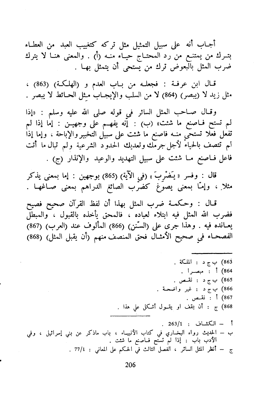 وقال صاحب المثل السائر في قوله صَلَّى اللَّهُ عَلَيْهِ وَسَلَّم َ: «إذا لم تستح فاصنع ما شئت» إنه يفهم على وجهين: إما إذا لم تفعل فعلا تستحي منه فاصنع ما شئت على سبيل التخبير والإباحة، وإما إذا لم تتصف بالحياء لأجل جرمك وتعديك الحدود الشرعية ولم تبال ما أتت فاعل فاصنع ما شئت على سبيل التهديد والوعيد والإنذار.