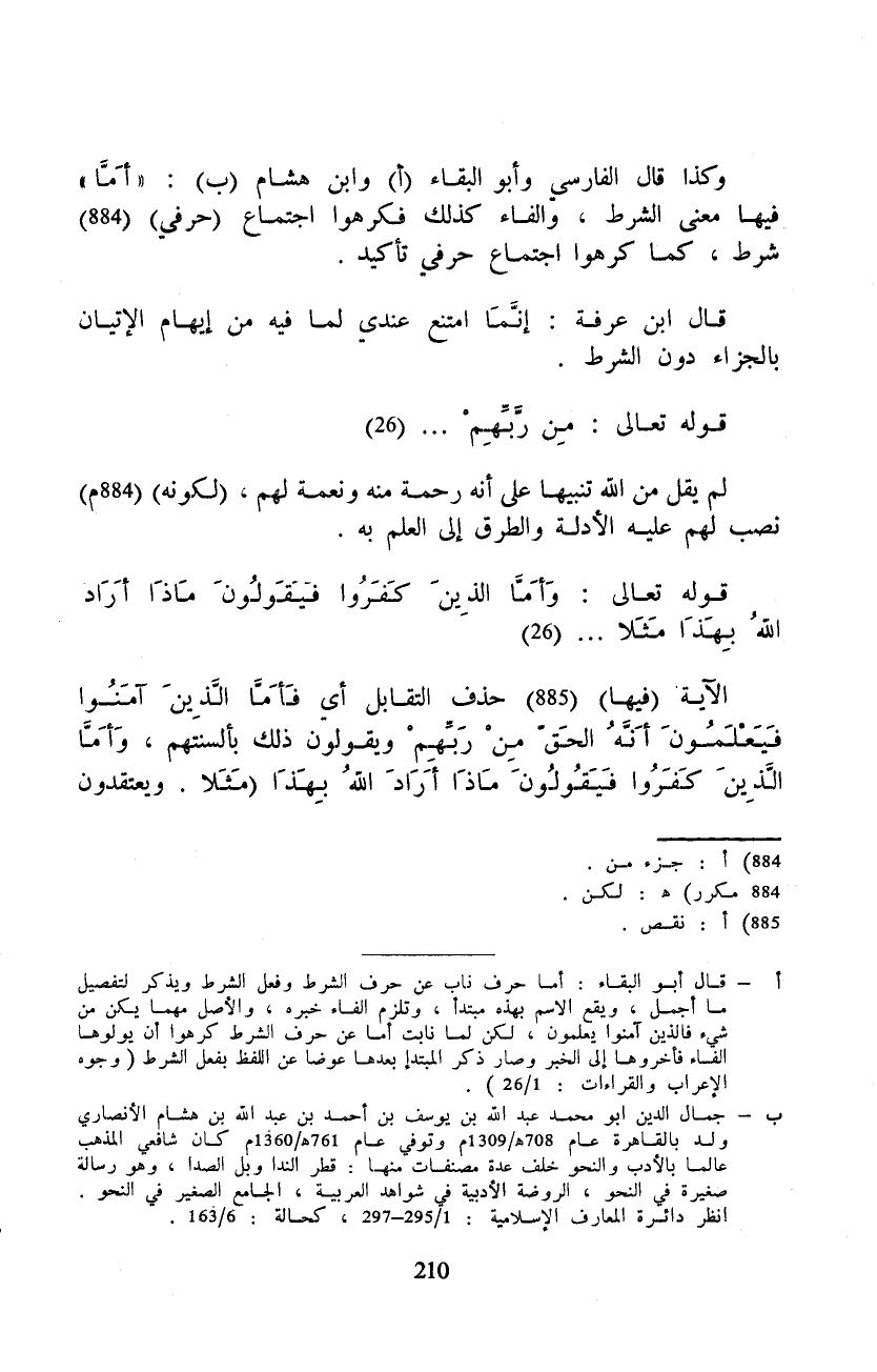 وكذا قال الفارسي وأبو البقاء وابن هشام: «أَمَّا» فيها معنى الشرط، والفاء كذلك فكرهوا اجتماع (حرفي) شرط، كما كرهوا اجتماع حرفي تأكيد.