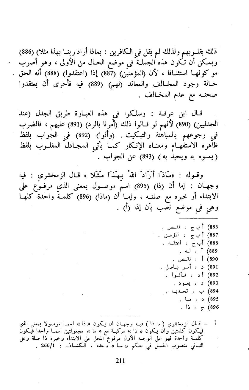وقوله: {مَاذَآ أَرَادَ الله بهذا مَثَلاً} قال الزمخشري: فيه وجهان: إما أن (ذا) اسم موصول بمعنى الذي مرفوع على الابتداء أو خبره مع صلته، وإما أن (ماذا) كلمة واحدة كلها وهي في موضع نصب بأن إذا.