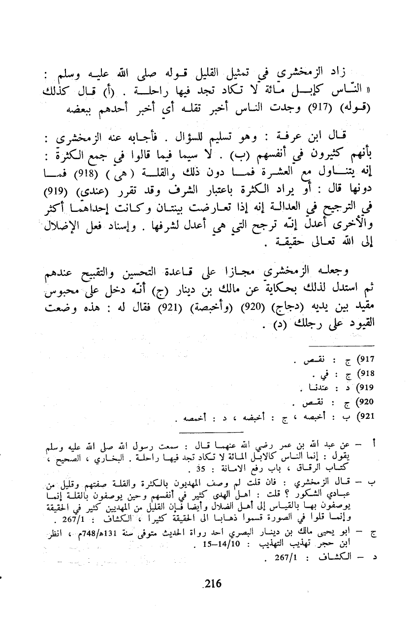 زاد الزمخشري في تمثيل القليل قوله صَلَّى اللهُ عَلَيْهِ وَسَلَّمَ: " النّاس كإبل مائة لا تكاد تجد فيها راحلة. قال كذلك (قوله) وجدت الناس أخبر تقله أي أخبر أحدهم ببعضه. قال ابن عرفة: وهو تسليم للسؤال. فأجابه عنه الزمخشري: بأنهم كثيرون في أنفسهم. لا سيما فيما قالوا في جمع الكثرة: إنه يتناول مع العشرة فما دون ذلك والقلة (هي) فما في الترجيح في العدالة إنه ترجح التي هي أعدل لشرفها. وإسناد فعل الإضلال إلى الله تعالى حقيقه. وجعله الزمخشري مجازاً على قاعدة التحسين والتقبيح عندهم ثم استدل لذلك بحكاية عن مالك بن دينار أنّه دخل على محبوس مقيد بين يديه (دجاج) (وأخبصه) فقال له: هذه وضعت القيود على رجلك.