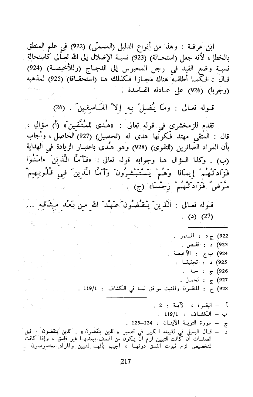 ابن عرفة: وهذا من أنواع الدليل (المسمى) في علم المنطق بالخطأ، لأنه جعل (استحالة) نسبة الأضلال إلى الله تعالى كاستحالة نسبة وضع القيد في رجل المحبوس إلى الدجاج (وللأخبصة) قال: فكما أطلقه هناك مجازاً فكذلك هنا (استحقاقاً) لمذهبه (وجرياً) على عادته الفاسدة. قوله تعالى: {ومَا يُضِلّ بِهِ إلاّ الفَاسِقينَ} . تقدم للزمخشري في قوله تعالى: {هُدى للمُتَّقِينَ} سؤال، قال: المتقي مهتد فكونها هدى له (تحصيل) الحاصل، وأجاب بأن المراد الصائرين (للتقوى) وهو هُدى بإعتبار الزيادة في الهداية. وكذا السؤال هنا وجوابه قول تعالى: {فَأَمَّا الَّذينَ ءامَنُوا فَزَادَتْهُمْ إيِمَاناً وَهُمْ يَسْتَبْشِرُونَ وَأَمَّا الَّذيِنَ ءامَنُوا مَّرَضٌ فَزَادتَتْهُمْ رِجْسًا} .