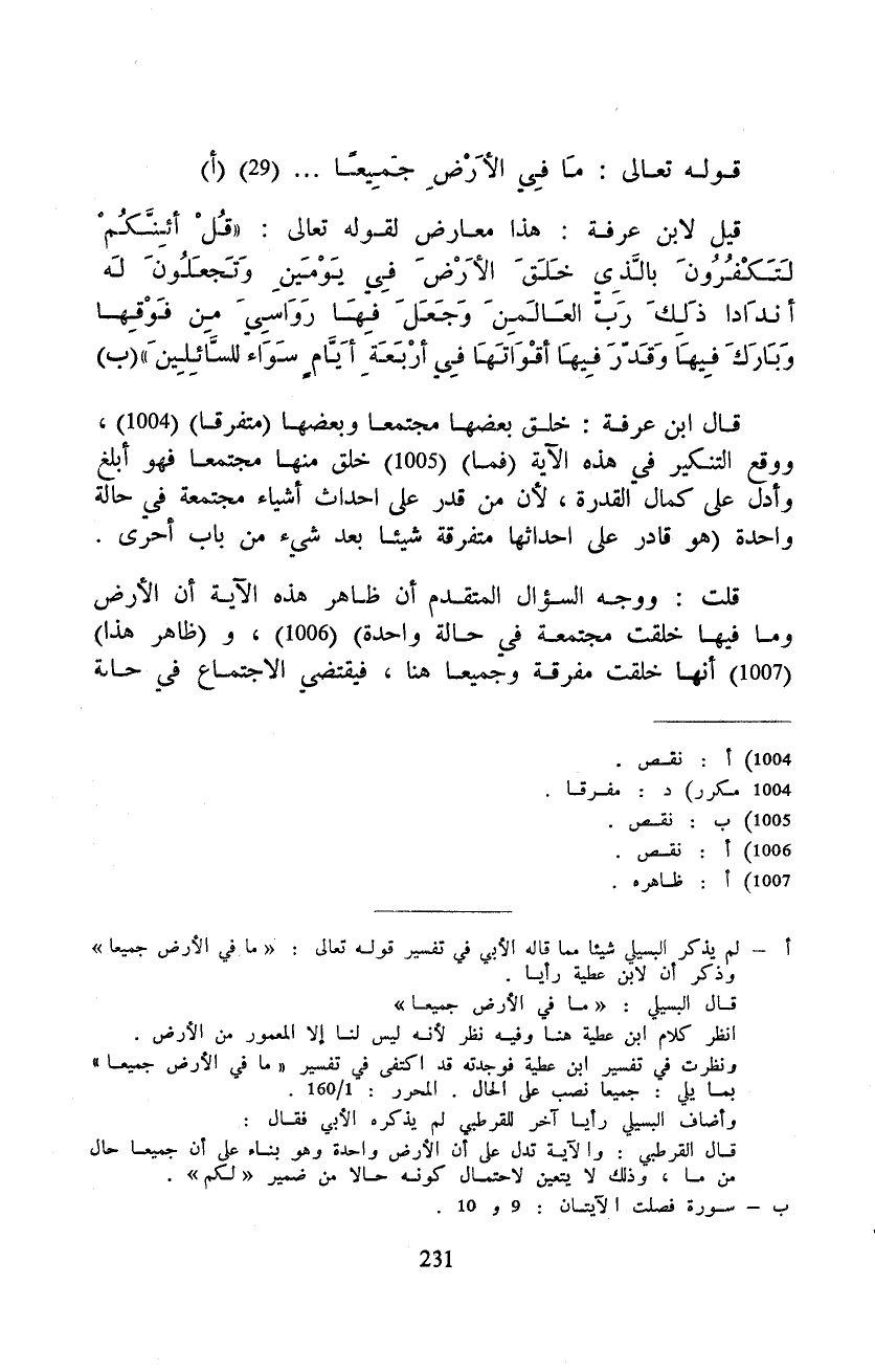 قيل لابن عرفة: هذا معارض لقوله تعالى: {قُلْ أَئِنَّكُمْ لَتَكْفُرُونَ بالذي خَلَقَ الأرض فِي يَوْمَيْنِ وَتَجْعَلُونَ لَهُ أَندَاداً ذَلِكَ رَبُّ العالمين وَجَعَلَ فِيهَا رَوَاسِيَ مِن فَوْقِهَا وَبَارَكَ فِيهَا وَقَدَّرَ فِيهَآ أَقْوَاتَهَا في أَرْبَعَةِ أَيَّامٍ سَوَآءً لِّلسَّآئِلِينَ}