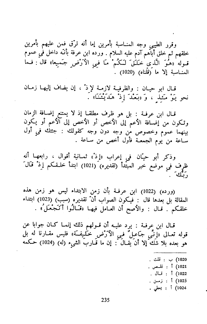 (ورده) ابن عرفة بأن زمن الابتداء ليس هو زمن هذه المقالة بل بعدها قال: فيكون الصواب أنّ تقديره (سبب) ابتداء خلقكم. قال: والأصح أن العامل فيها {قَالُواْ أَتَجْعَلُ} .