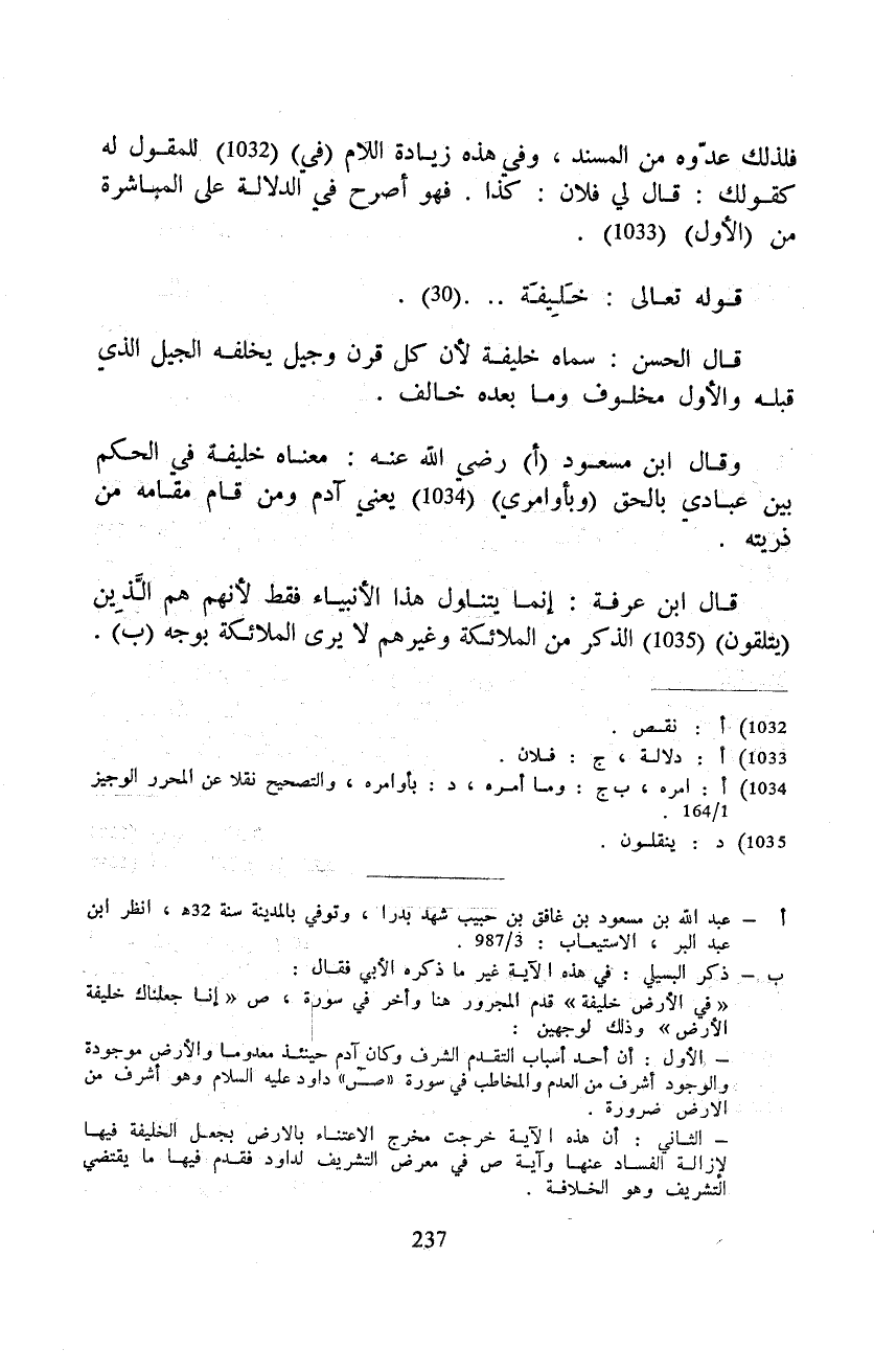 وقال ابن مسعود رَضِيَ اللَّهُ عَنْه: معناه خليفة في الحكم بين عبادي بالحق (وبأوامري) يعنى آدم ومن قام مقامه من ذريته.