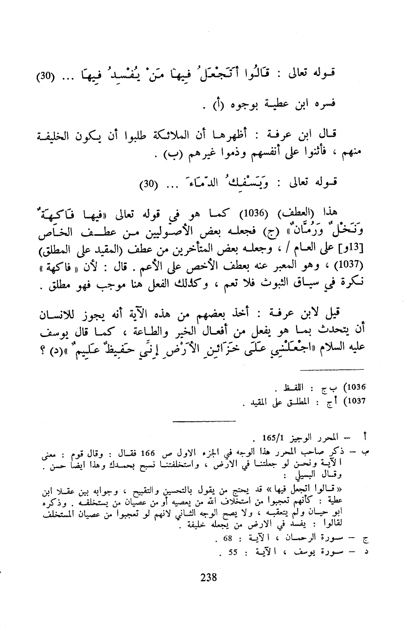 هذا (العطف) كما هو في قوله تعالى {فِيهِمَا فَاكِهَةٌ وَنَخْلٌ وَرُمَّانٌ} فجعله بعض الأصوليين من عطف الخاص على العام/، وجعله بعض المتأخرين من عطف (المقيد على المطلق) ، وهو المعبر عنه بعطف الأخص على الأعم. قال: لأن «فاكهة» نكرة في سياق الثبوت فلا تعم، وكذلك الفعل هنا موجب فهو مطلق.