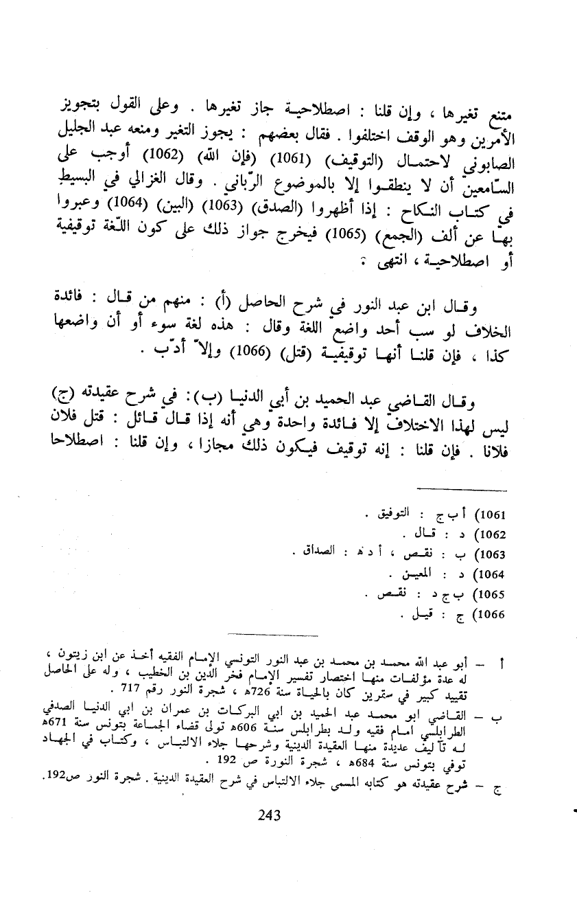 امتنع تغيرها، وإن قلنا: اصطلاحية جاز تغيرها. وعلى القول بتجويز الأمرين وهو الوقف اختلفوا. فقال بعضهم: يجوز التغير ومنعه عبد الجليل الصابوني لاحتمال (التوقيف) (فإن الله) أوجب على السّامعين أن لا ينطقوا إلا بالموضوع الرّباني. وقال الغزالي في البسيط في كتاب النكاح: إذا أظهروا (الصدق) (البين) وعبروا بها عن ألف (الجمع) فيخرج جواز ذلك على كون اللّغة توقيفية أو اصطلاحية، انتهى: