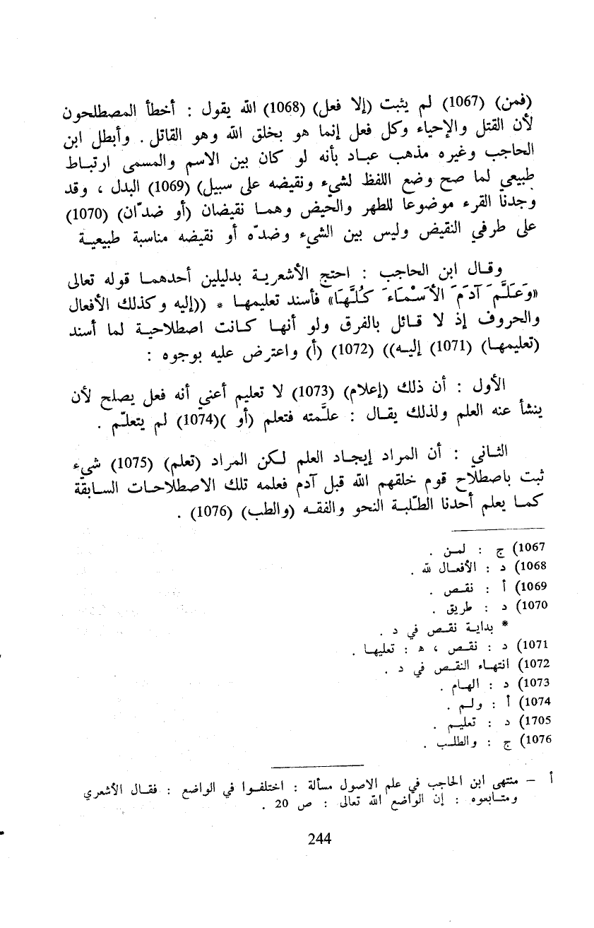 وقال ابن الحاجب: احتج الأشعرية بدليلين أحدهما قوله تعالى {وَعَلَّمَءَادَمَ الأسمآء كُلَّهَا} فأسند تعليمها ((إليه وكذلك الأفعال والحروف إذ لا قائل بالفرق ولو أنها كانت اصطلاحية لما أسند (تعليمها) إليه)) واعترض عليه بوجوه: