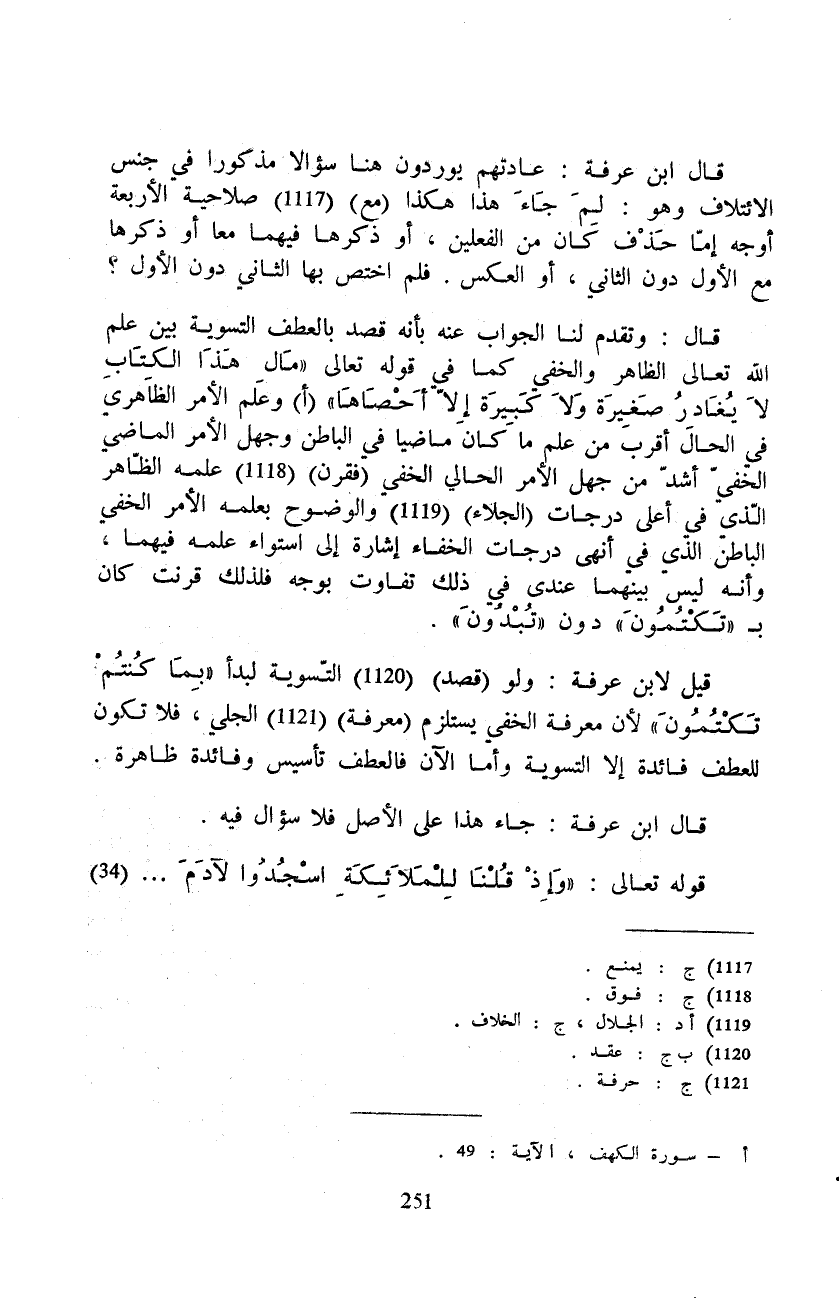 قيل لابن عرفة: ولو (قصد) التّسوية لبدأ «بِمَا كُنتُمْ تَكْتُمُونَ» لأن معرفة الخفي يستلزم (معرفة) الجلي، فلا تكون للعطف فائدة إلا التسوية وأما الآن فالعطف تأسيس وفائدة ظاهرة.