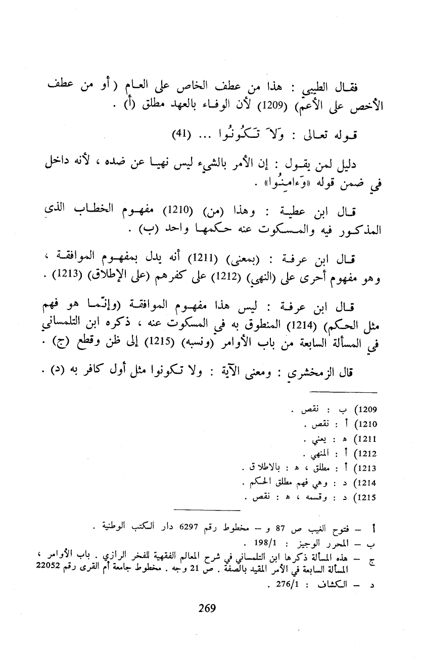 قال ابن عرفة: ليس هذا مفهوم الموافقة (وإنّما هو فهم مثل الحكم) المنطوق به في المسكوت عنه، ذكره ابن التلمساني في المسألة السابعة من باب الأوامر (ونسبه) إلى ظن وقطع.