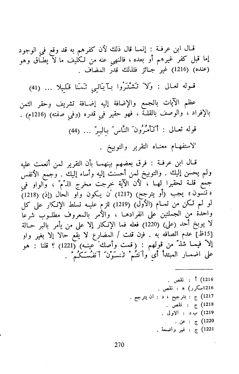 قال ابن عرفة: فرق بعضهم بينهما بأن التقرير لمن أنعمت عليه ولم يحسن إليك. والتوبيخ لمن أحسنت إليه وأساء إليك. وجمع الأنفس جمع قلة تحقيرا لها، لأن الآية خرجت مخرج الذّمّ، والواو في «تنسون» يجب (أو يترجح) أن يكون واو الحال (إذ) لو لم تكن من تمام (الأول) للزم عليه تسلط الإنكار على كل واحدة من الجملتين على انفرادها، والأمر بالمعروف مطلوب شرعا لا يوبخ أحد (على) فعله فما الإنكار إلا على من يأمر بالبر حالة عدم اتصافه به. فإن قلت / المضارع لا يقع حالا إلا بغير واو إلاّ فيما شذّ من قولهم: (قمت وأصك عينه) ؟ قلنا: هو على اضمار المبتدأ أي وأنتُمْ تَنسَوْنَ أنفُسَكُمْ.