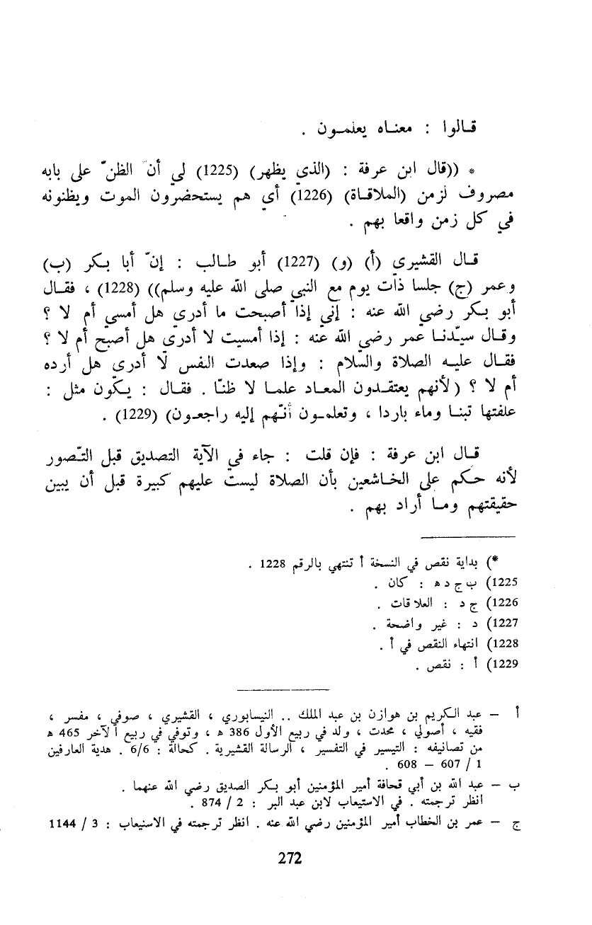 قال القشيري أبو طالب: إنّ أبا بكر وعمر جلسا ذات يوم مع النبي صَلَّى اللَّهُ عَلَيْهِ وَسَلَّم َ، فقال أبو بكر رَضِيَ اللَّهُ عَنْه: إني إذا أصبحت ما أدري هل أمسي أم لا؟ وقال سيّدنا عمر رَضِيَ اللَّهُ عَنْه: إذا أمسيت لا أدري هل أصبح أم لا؟ فقال عَلَيْهِ الصَّلَاة وَالسَّلَام ُ: وإذا صعدت النفس لا أدري هل أرده أم لا؟ (لأنهم يعتقدون المعاد علما لا ظنّا. فقال: يكون مثل: علفتها تبنا وماء باردا، وتعلمون أنّهم إليه راجعون) .