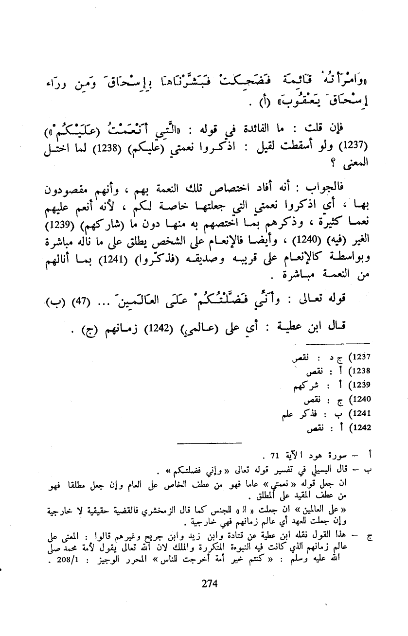{وامرأته قَآئِمَةٌ فَضَحِكَتْ فَبَشَّرْنَاهَا بِإِسْحَاقَ وَمِن وَرَآءِ إِسْحَاقَ يَعْقُوبَ} فإن قلت: ما الفائدة في قوله: {التي أَنْعَمْتُ (عَلَيْكُمْ} ) ولو أسقطت لقيل: اذكروا نعمتي (عليكم) لما اختل المعنى؟