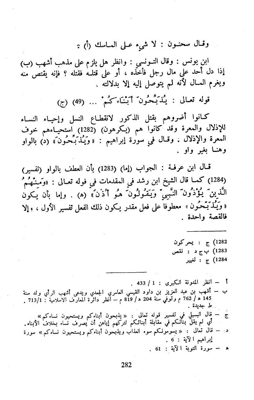 قال ابن عرفة: الجواب (إما) بأن العطف بالواو (تفسير) كما قال الشيخ ابن رشد في المقدمات في قوله تعالى: {وَمِنْهُمُ الذين يُؤْذُونَ النبي وَيِقُولُونَ هُوَ أُذُنٌ} وإما بأن يكون «وَيُذَبِّحُونَ» معطوفا على فعل مقدر يكون ذلك الفعل تفسير الأول، وإلا فالقصة واحدة.