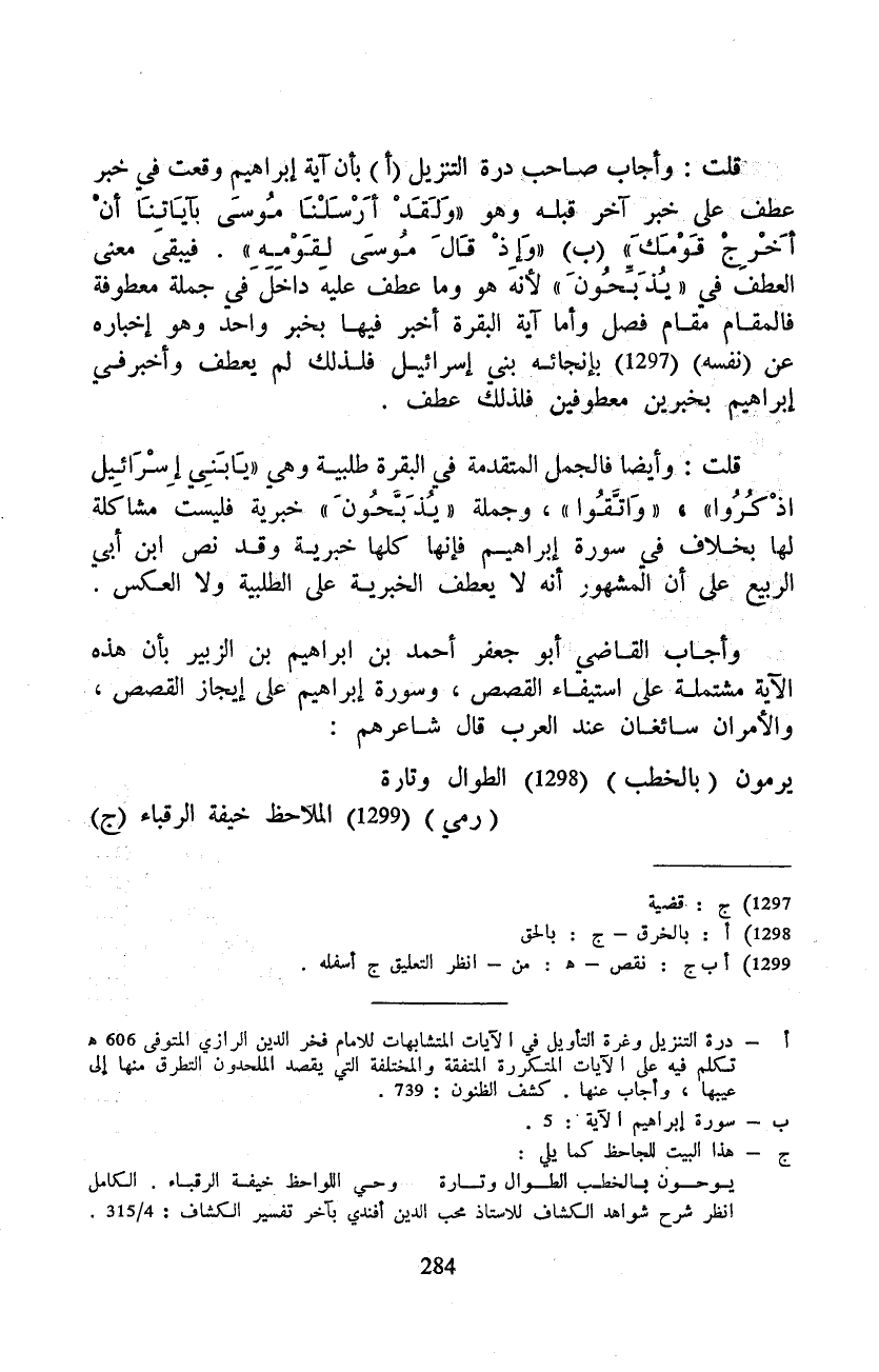 قلت: وأيضا فالجمل المتقدمة في البقرة طلبية وهي {يَابَنِي إِسْرَائِيلَ اذكروا} «واتَّقُواْ» ، وجملة «يُذَبِّحونَ» خبرية فليست مشاكلة لها بخلاف في سورة إبراهيم فإنها كلها خبرية وقد نص ابن أبي الربيع على أن المشهور أنه لا يعطف الخبرية على الطلبية ولا العكس.