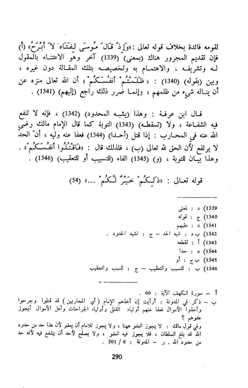 قال ابن عرفة: وهذا (يشبه المحدود) ، فإنه لا تنفع فيه الشفاعة، ولا (تسقطه) التوبة كما قال الإمام مالك رَضِيَ اللَّهُ عَنْه في المحارب: إذا قتل (أحدا) فعفا عنه وليه، أنّ الحد لا يرتفع لأن الحق لله تعالى، فلذلك قال: {فاقتلوا أَنفُسَكُمْ} وهذا بيان للتوبة، (و) الفاء (للتسبيب أو للتعقيب) .